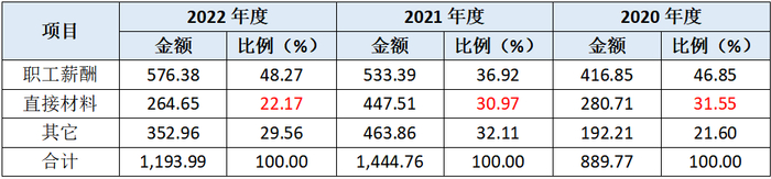 由上表可见,发行人研发费用呈波动上涨趋势,报告期复合增长率15.84%,研发投入有加强的趋势。但是其研发费用中,直接材料的占比却大幅下滑,从31.55%下隆到22.17%,降幅为42.31%。