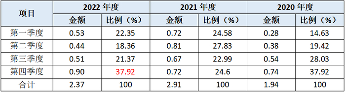 从上表可见,发行人除2021年度各季节营收占比较为平均以外,2020年度和2022年度第四季度营收占比均显著偏高。