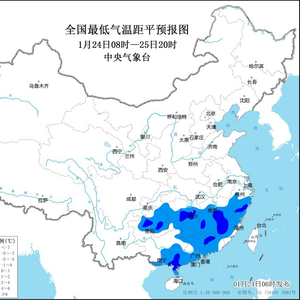 预计,1月24日至25日,贵州、湖南中南部、江西中南部、浙江中南部、福建、广东、广西东部等地最低气温或平均气温较历史同期偏低5℃以上,其中,贵州中东部、湖南中部、江西中南部、浙江南部、福建西部、广东西南部、广西东南部等地的部分地区偏低7℃以上(见图1),最低气温0℃线位于广西北部、广东北部一带(见图2)。中央气象台1月24日06时继续发布低温蓝色预警。