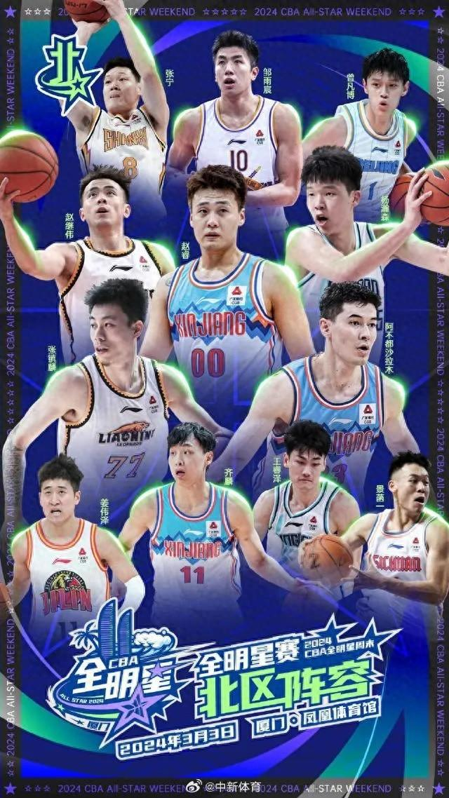 全明星赛替补名单23日公布,北区:张宁(山西)、邹雨宸(北控)、曾凡博(北京)、姜伟泽(吉林)、齐麟(新疆)、王睿泽(青岛)、景菡一(四川)。南区:贺希宁(深圳)、王哲林(上海)、程帅澎(浙江)、沈梓捷(深圳)、吴前(浙江)、林葳(南京)、徐杰(广东)。