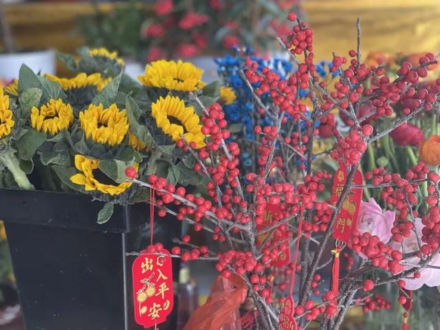 红果累累的冬青、五颜六色的蝴蝶兰……上午,在海汇街的一家花店内,琳琅满目的年宵花已经上架,满满都是过年的气氛。