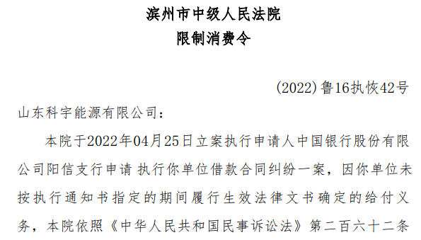 值得注意的是,科宇能源曾被中国银行股份有限公司阳信支行、招商银行股份有限公司济南分行、华夏银行股份有限公司东营东城支行等多家银行申请限高令。最近一次是在2022年11月30日,滨州市中级人民法院公告称,本院于2022年4月25日立案执行申请人中国银行股份有限公司阳信支行申请执行科宇能源借款合同纠纷一案,因科宇能源未按执行通知书指定的期间履行生效法律文书确定的给付义务,依照相关法律规定,对科宇能源采取限制消费措施。