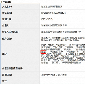 根据国家药监局国产普通化妆品备案信息平台显示,早在去年12月,珀莱雅先后备案了珀莱雅肌源修护轻盈霜、珀莱雅肌源修护盈润霜两款产品。而据成分一栏显示,珀莱雅肌源修护轻盈霜、盈润霜两款产品中均包含“胶原”成分。
