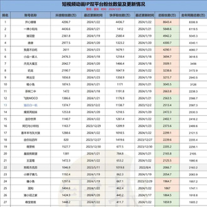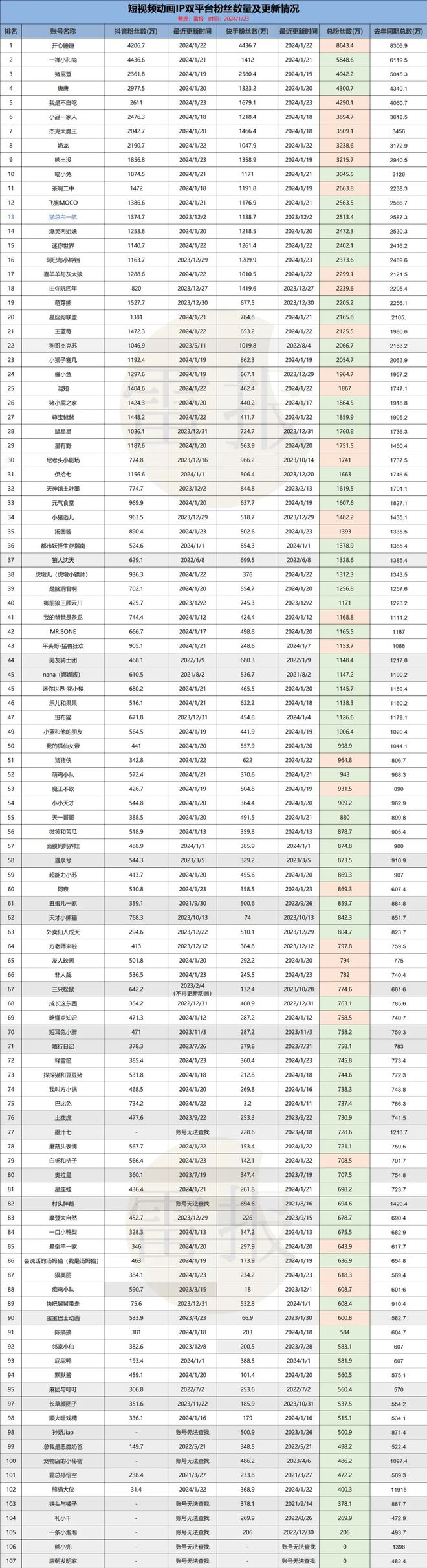 雷报对持续关注的107个短视频动画账号的现有粉丝数量(抖音和快手)及最后更新时间进行了盘点(截至2024年1月23日,人工统计存在误差)。