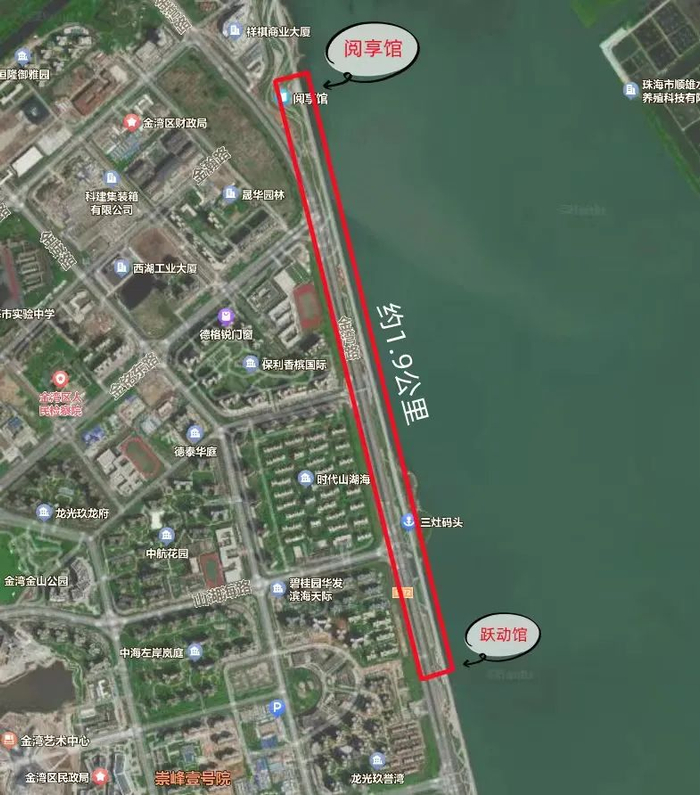 金湾路东侧,阅享馆东侧广场至跃动馆北侧,约1.9公里。