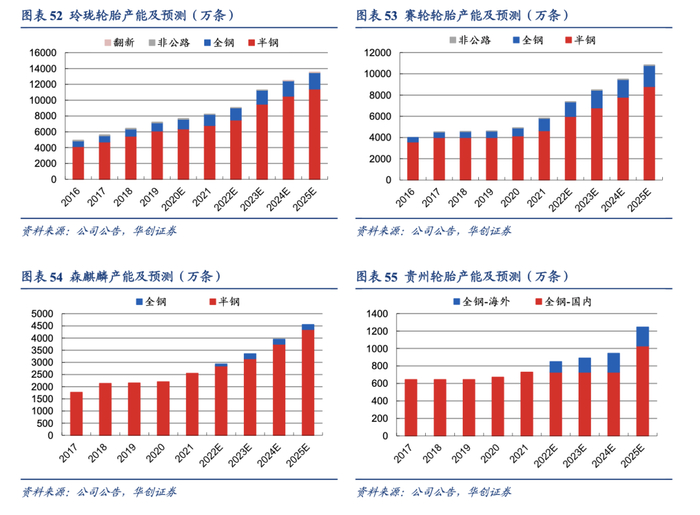 头部企业海外工厂建设稳步推进,未来将持续释放业绩增量。对于国内头部轮胎上市企业玲珑轮胎、赛轮轮胎、森麒麟和贵州轮胎,其均已于海外进行了工厂布局,分别位于泰国(玲珑轮胎,森麒麟)和越南(赛轮及其与固铂的合资工厂,贵州轮胎),同时新的海外工厂在稳步推进。如玲珑轮胎的塞尔维亚工厂将于 2023 年初投产,赛轮轮胎的 柬埔寨工厂已于今年四季度实现投产,森麒麟的西班牙工厂预期将在 2024 年上半年投产,贵州轮胎的越南二期将于 2023 年投产。我们认为海外新基地的投产将为头部企业进一步奠定先发优势:1)持续的资本开支和产能放量提升公司规模和市占率;2)更趋全球化的布局可帮助公司有效规避贸易壁垒及海运风险;3)新工厂紧邻欧洲市场和头 部车企,有助于公司深化和主机厂的合作,以及高性价比产品进一步抢占当地市场;4) 享受海外市场的高利润空间,提升公司盈利中枢。从几家企业未来产能扩张计划看,玲珑已披露其长期“7+5”战略规划,目前在建湖北荆门、吉林长春、欧洲塞尔维亚等工厂, 长期陕西铜川和安徽合肥工厂已立项;赛轮的山东潍坊、越南三期以及柬埔寨等多个基地和项目在稳步建设;森麒麟已披露其长期的“833plus”规划,目前泰国二期在建;贵州轮胎越南工厂已投产。我们预计玲珑至 2025 年轮胎产能将突破 1.35 亿条,赛轮至 2025 年轮胎产能将突破 1.05 亿条,森麒麟至 2025 年轮胎产能将突破 4500 万条,贵轮至 2025 年轮胎产能将突破 1200 万条。持续的资本开支和产能扩张将有望为玲珑、赛轮和森麒 麟几家头部企业带来每年 15%-20%的增长。