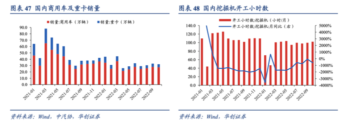 4)全钢胎国内需求或迎来复苏。今年国内全钢胎受国五国六切换及地产景气低迷等因素影响,需求下滑较大。近期国内地产利好政策频发,乘用车及重卡销量已有企稳回升态势。9 月国内商用车、重卡销量分别环比+7.9%、+12.1%;10 月国内商用车销量 27.3 万辆、重卡销量 4.8 万辆,分别环比-1.8%、-7.0%,下滑原因或因十一假期影响。同时, 挖掘机开工小时数据也有提升趋势,10 月国内挖机开工小时数为 102.1 小时,连续两月 环比提升。我们看好明年地产政策转向宽松叠加国内经济复苏预期下,全钢胎景气有望 底部提升。