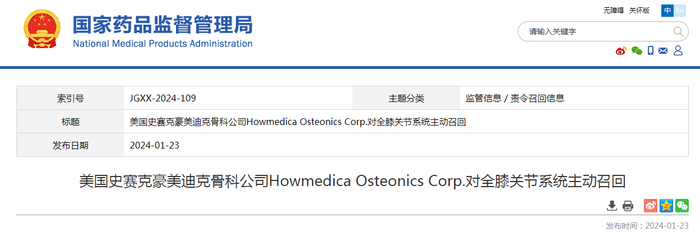 美国史赛克豪美迪克骨科公司Howmedica Osteonics Corp.对全膝关节系统主动召回