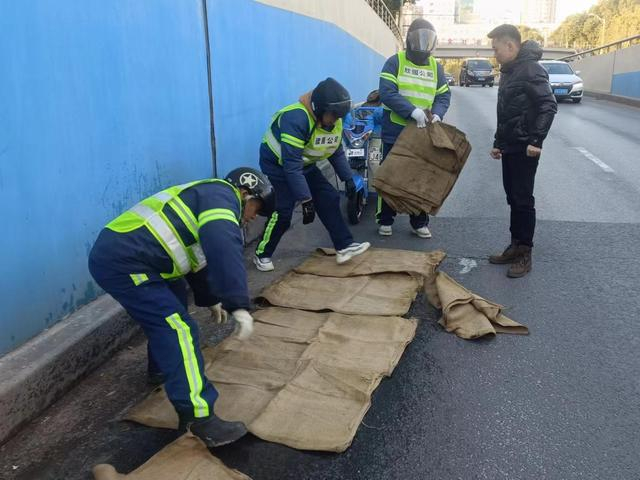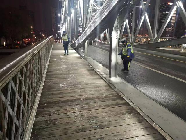 1月23日,市区最低温度零下4度到零下3度,有冰冻。为确保路人能够安全通行,欣谊公司的环卫工人们清晨五点多就已上岗,在苏州河的乍浦路桥等容易结冰的路面上撒盐,并在沿途铺设麻包,防止路人滑倒。