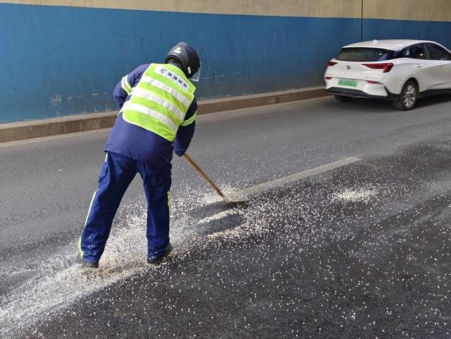 而在老城厢,一支专业的“破冰队”近几日也是清晨就上岗。清扫班组长姚乐带领着班组成员和街道人员一起,将盐细致覆盖在每一块冰块上,在化学融冰加物理铲除的“双重攻击”下,将路面上冰块“消灭”,方便晨起的过往市民出行。不仅如此,考虑到融冰后的水可能再次冻结,工人们还在姚乐的指挥下在融冰处铺设草席,有效杜绝了可能导致路滑的所有隐患。