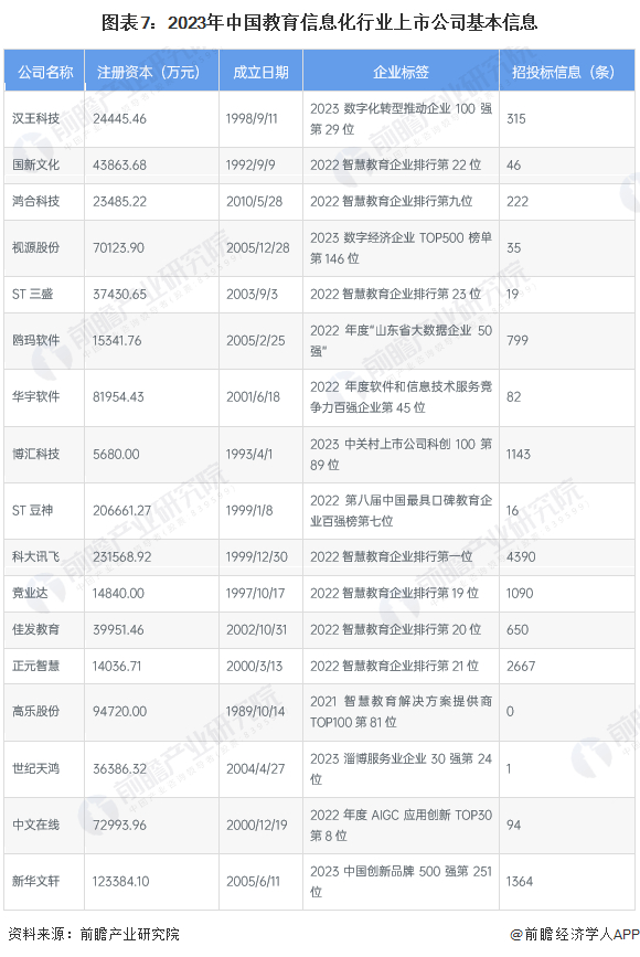通过已有的公开信息进行分析,我国教育信息化行业上市公司注册资本最高的是科大讯飞,成立日期最早的是高乐股份,招投标信息最多的是科大讯飞,从企业标签来看,教育信息化相关上市企业大多为智慧教育领域的领先厂商。