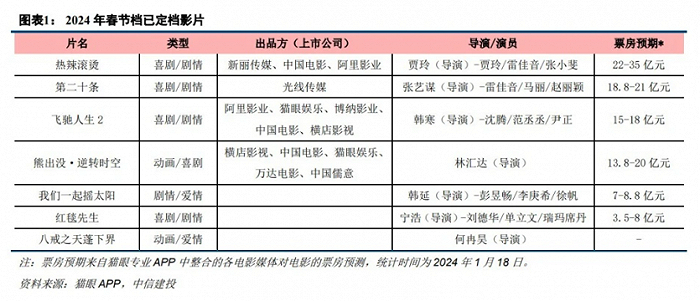 时间线拉到今年的春节档,依然是新王天下,老牌影企再度缺席。头部三甲影片的出品方中,猫眼参投了《飞驰人生2》,光线主控《第二十条》,《热辣滚烫》和《飞驰人生2》背后均有阿里影业的身影。仅《熊出没·逆转时空》一部影片有万达参投。
