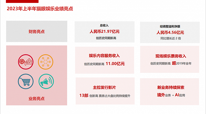 而猫眼娱乐的中期业绩报告(截至2023年6月30日的六个月)显示,参与发行、出品的国产影片共24部(主发影片13部),占同期国产影片总票房的八成以上,九部影片进入报告期内国产片票房前十。其娱乐内容服务(发行、出品影片收益)的收入为11亿,是2022年同期收入的接近两倍。