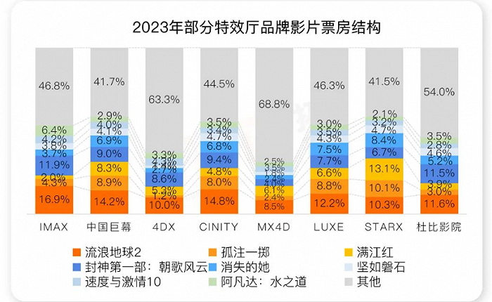 上下游的变化向来是一以贯之的,下游特效厅的增长离不开上游供给中特效大片的支持。《流浪地球2》和《封神第一部》两部工业巨制在大部分特效厅品牌的票房结构中占据重要比例。在进口大片日渐势弱的情况下,国产工业大片担负起了下游影院往高端化、差异化方向迈进的重要责任。但《流浪地球》系列毕竟4年一部,没有《流浪地球》的年份里还需要更多工业化作品站出来。