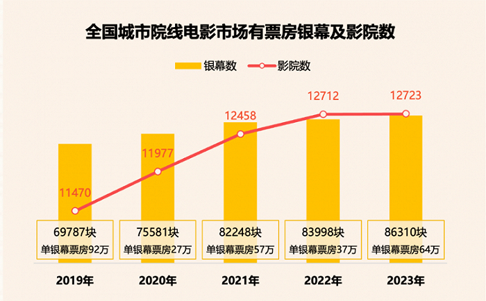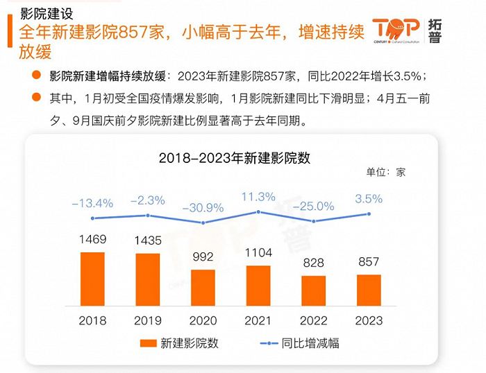 据拓普报告,2023年新建影院857家,同比小幅增长3.5%。总体在映影院数和在映银幕数虽仍然保持正增长,但涨幅已经连续5年缩小。