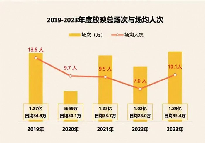在场均人次和观影频次上,对比更为明显。2023年放映总场次为1.29亿,与2019年的1.27亿基本持平,但在场均人次上,存在明显距离,2019年为13.6人,2023年为10.1人。人均观影频次上,2023年为2.58次,相较于2020-2022年的2.13次只有小幅提升,跟疫情前2017年的3.38次,还有一定距离。