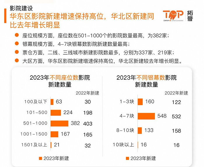 新建影院决策也更趋理性、谨慎。拓普数据显示,和2022年对比,新建影院中座位数在500以下的、银幕数在7块以下的中小型影院增长较多,大型影院增长量则不及2022年。新建影院所在地区也以三线和五线城市增长较多,二线城市更少,下沉趋势明显。
