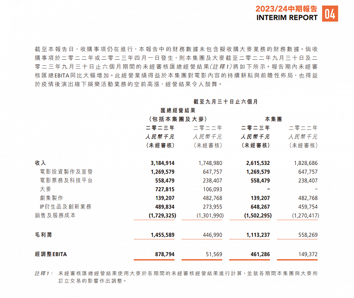 据阿里影业中期业绩报告(截至2023年9月30日的六个月)显示,报告期内电影投资制作及宣发的收入为12.7亿,增幅约96%。阿里影业共参与了37部电影的出品和发行(其中主宣发项目18部、合制项目5部),其票房占总票房比例接近60%,七部影片进入同期票房前十。