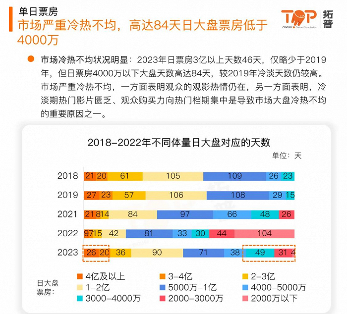 据拓普数据显示,2023年日票房3亿以上天数46天,略少于2019年,但日票房4000万以下大盘天数高达84天。全年最低日票房1692万,相较于2019年的3231万有较大距离。观众热情仍在,但主要集中在档期热门电影。