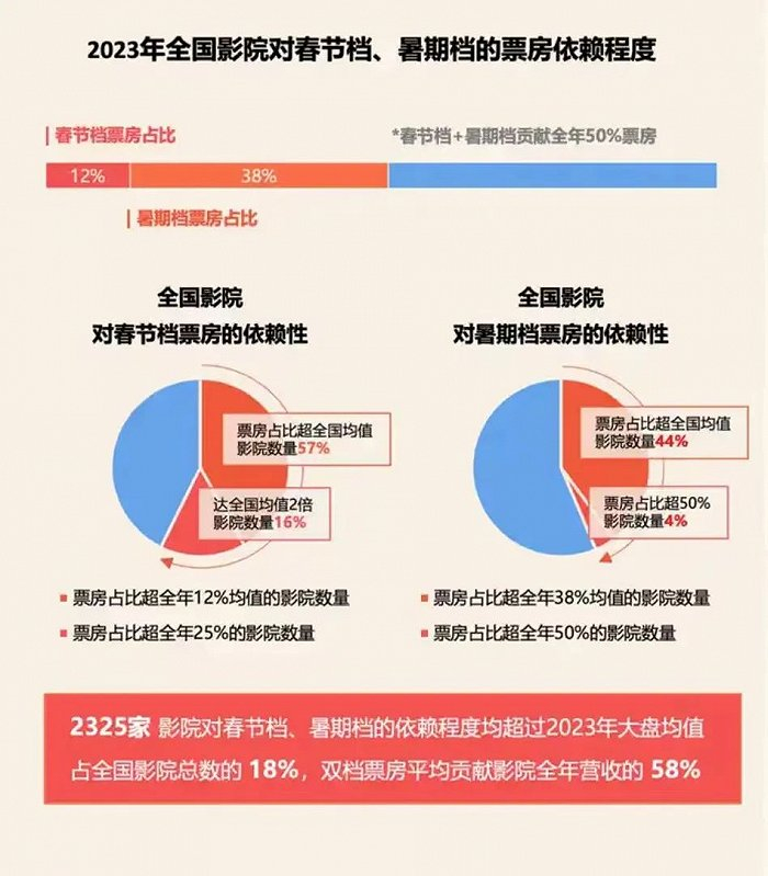 从下游的收益来看也是一致的。2325家影院对春节档、暑期档的依赖程度均超过2023年大盘均值,占全国影院总数的18%,双档票房平均贡献影院全年营收的58%。