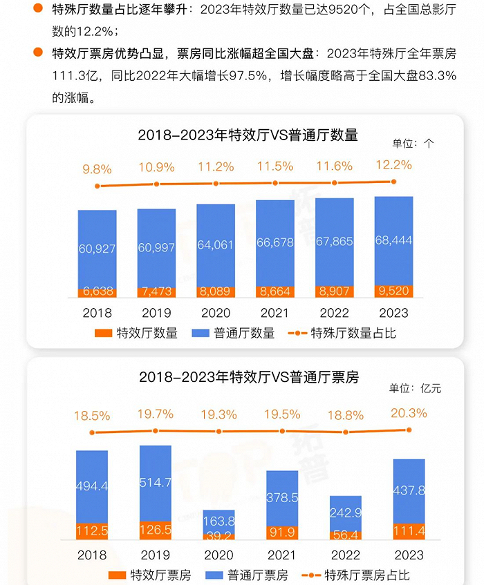 但在下沉的大趋势下,值得注意的是,特效厅的增长跑赢了大盘。2023年,特效厅数量达9520个,占全国总影厅数的12.2%,占比逐年升高。全年贡献票房达到111.3亿,占到了总票房的20.3%,占比相较过去5年显著提升。