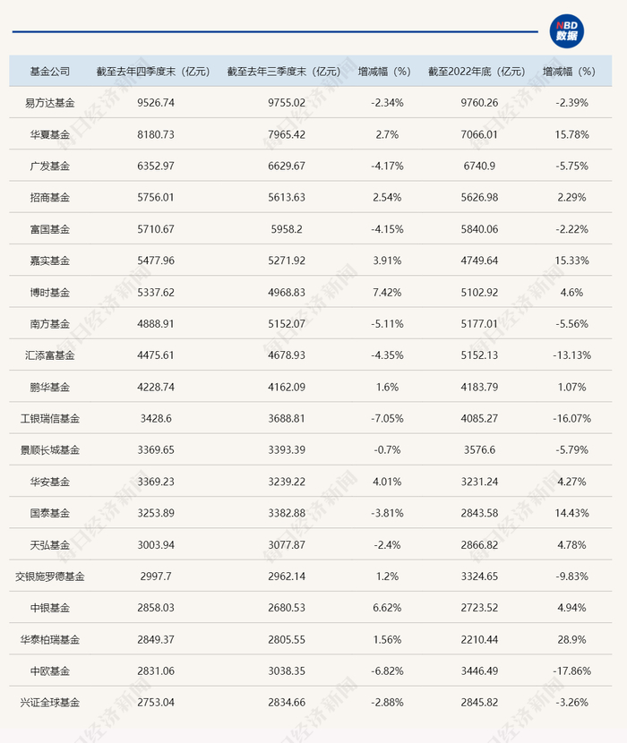 而排名第6~10的基金公司名单变化则更为明显。在第三季度末和2022年年末都没有挤进管理规模前十名的招商基金持续发力,以8606.22亿元的管理总规模跻身前十,排在第8位;汇添富基金从去年三季度末的第8名下降至第10,鹏华基金则掉出了总规模前十的行列。