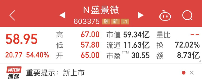1月24日,盛景微正式登录上交所,成2024年第12家上市的公司,发行价38.18元/股,收盘价58.95元/股,最新市值59.34亿元。