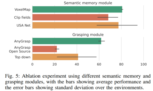 由图 5 可得,OK-Robot 中使用的 VoxelMap 略微优于其他语义记忆模块。至于抓取模块,AnyGrasp 明显优于其他抓取方法,在相对规模上比最佳候选方法(自上而下抓取)的性能高出近 50%。然而,基于启发式的算法,HomeRobot 的自上向下抓取击败了开源 AnyGrasp 基线和 Contact-GraspNet,这一事实表明构建真正的通用抓取模型仍然很困难。