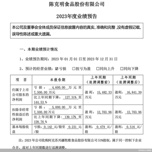 1月24日,克明食品股价跌至8.31元/股,下跌0.36%。前一晚,克明食品发布2023年业绩预告,预计2023年净亏损4600万—7500万元,同比由盈转亏,净利润相较于上年同期下降127.31%至144.53%。这也是克明食品自2012年上市以来年度业绩首次亏损。