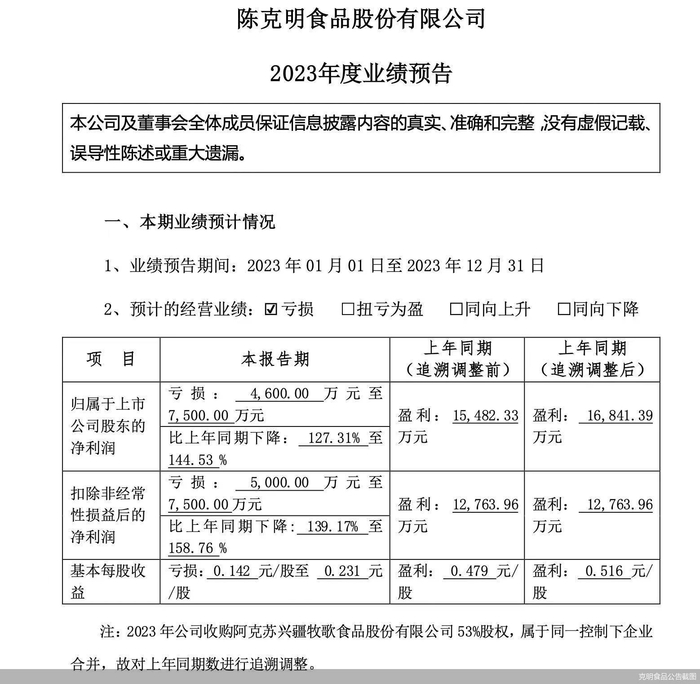 对于上半年业绩下滑,克明食品在当时解释为,收购的阿克苏兴疆牧歌受到生猪养殖行业周期性影响,导致公司养殖板块经营业绩出现亏损,以及市场环境变化导致公司主营产品销量及营业收入减少。
