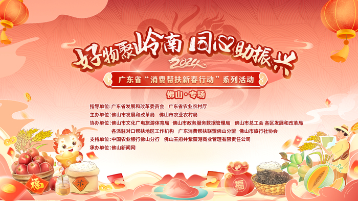 1月26-27日,广东省2024年“消费帮扶新春行动”之佛山专场活动将在禅城区王府井紫薇港开展。活动以“好物聚岭南,同心助振兴”为主题,现场将举行2024年佛山市“消费帮扶新春行动”启动仪式和展销集市,以展示展销、趣味游戏、折扣促销等方式吸引广大市民游客购买来自西藏、新疆、黑龙江等各省市的特色农产品,一站式体验地域文化魅力与独特风情,抢抓2024年春节、元宵节等消费旺季契机,持续拓宽佛山对口帮扶地区农牧和文旅产品销售渠道。