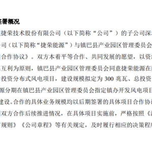 投资公告显示,甲方(镇巴县产业园区管理委员会)将积极支持协助乙方(捷荣能源)进行风电资源开发,成立领导小组,协助乙方办理拟合作项目所需的相关报批备案手续,并提供项目核准批复、建设等相关支持工作,同时协助协调进行农村电网建设改造,确保本项目具备消纳条件等。