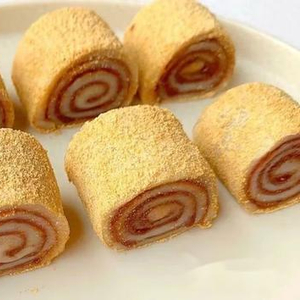 涂抹均匀后,从一边开始卷起来,卷完再撒一层熟黄豆粉。