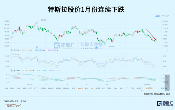 而在月初公布的数据,第四季度特斯拉产销均略高于预期,生产约49.5万辆汽车,交付量超过48.4万辆。2023年特斯拉的汽车交付量同比增长38%至181万辆,超过其此前设定的180万辆目标,但未达到马斯克的200万辆的目标。虽然交付创历史新高,但资本市场对这个消息的反映平淡,股价这个月内已经跌了接近2成。