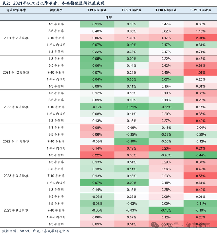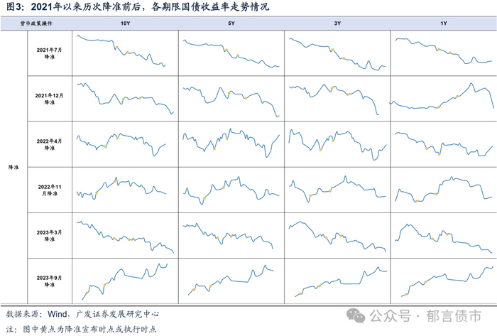 另一方面是降准之后可能不一定带来利率的下行,关键在于降准后,市场对资金面转松或者宽货币预期是否继续升温。如2022年4月和11月、2023年9月。其中2022年4月13日,国常会提到“适时运用降准等货币政策工具”,不过2022年4月15日,央行发布降准公告,降准幅度为0.25个百分点,低于以往通常降准的幅度(0.5个百分点),且MLF利率未下调,市场对宽货币的期待有所降温,使得降准落地后利率反而上行。2022年11月23日,国常会提到“适时适度运用降准等货币政策工具,保持流动性合理充裕”,受此影响,当日夜盘利率有所下行。但11月25日下午,央行发布降准公告,再次降准0.25个百分点,降准幅度持平上次,而当日10年国债收益率上行3.5bp,反映出利多出尽的逻辑,长端利率受地产政策放松、防疫政策优化的影响延续上行。2023年9月14日央行宣布降准25bp,但由于政府债缴款、跨季等因素带来的资金缺口较大,降准后资金面整体平衡,未能明显转松,使得利率延续上行趋势。