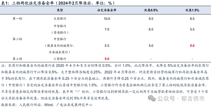 一是降准0.5%,释放资金1万亿元左右,幅度超出以往四轮。2022-2023四次降准幅度均为0.25%,此次降准幅度达到0.5%,幅度翻倍,释放长期资金1万亿元。参考2023年12月末存款余额约284.3万亿元,剔除不缴准的财政存款和非银机构存款,再乘以幅度0.5个百分点,对应降准释放资金约12657亿元。但考虑到部分机构法准率已经低至5%,不在降准范畴,这使得实际释放资金要小于这一数字。从1万亿元与12657亿元两个数字推测,约21%的银行(按存款规模)法定准备金率已降至5%,与我们在《9月降准,及时雨》中估算的20%较为接近。