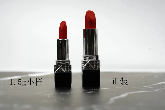 来看看对比,赠送的小样外观跟正装一致,携带方便,而且还是迪奥经典正红色,真的能用好久!