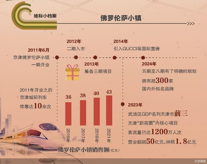 2011年6月,京津佛罗伦萨小镇正式开业,一期项目大概约2万平方米,引入不足一百个品牌,但国际品牌占比大多数,成为内地首个纯正意式风格的奥特莱斯。开业初期,该项目就引入了十余个全国首家的奥莱品牌,呈现出与京津冀商圈中其余奥特莱斯的差异化。直至今日,京津佛罗伦萨小镇拥有超300家国内外知名品牌,众多品牌将其在地区乃至国内的首家奥特莱斯门店设在了京津佛罗伦萨小镇,包括宝格丽、巴黎世家、亚历山大·麦昆、三宅一生等。同时,2011年开业之后,京津城际列车在武清的停靠次数也从三四次变为了十余次。