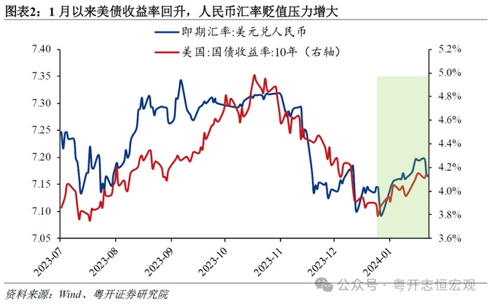 第二,降息受到防止资金空转、维护人民币汇率等多重约束。当贷款利率较低时,部分企业会利用低成本融资来购买理财产品进行套利,资金脱实向虚并积聚风险。此外,1月美国经济指标表现尚可,市场对美联储降息的预期有所降温,10年期美债收益率和美元指数走强,对人民币汇率形成压力。如果此时降息,不利于人民币汇率稳定。