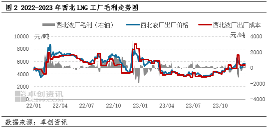2023年,西北LNG液厂的利润倒挂现象仍然存在,且整体利润空间受到一定程度的压缩。根据卓创资讯的数据统计,2023年西北LNG工厂的毛利为42.28元/吨,较2022年减少了264.06元/吨,降幅高达86.2%,且基本每个月都会出现利润亏损的现象。类似于接收站企业,影响西北LNG工厂价格和利润的主要因素是成本。此外,西北地区大多数液厂的气源是通过竞拍方式获取的,其成本变动更为频繁。