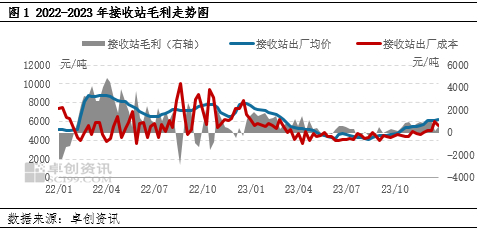 2023年接收站利润亏损时段有所减少,但整体利润空间压缩明显。全年来看,接收站周度毛利多数时段呈正增长,很少出现如同2022年那样的亏损。影响LNG接收站毛利的主要因素是进口成本。经过2022年非常规市场行情后,2023年国际和国内LNG市场逐步回归理性,国内LNG进口价格高位回落。据上海石油天然气交易中心数据,2023年LNG接收站综合进口到岸价格为4275.7元/吨,较去年同期下降1275.8元/吨,降幅22.98%。因此,在成本下调的推动下,2023年接收站利润并未出现大面积倒挂现象。然而,成本的下降一方面在一定程度上抑制了价格的上涨,另一方面,进口成本下调之下,是进口量的增长,2023年,我国LNG进口量出现恢复性增长,据卓创资讯数据统计,2023年,中国LNG进口量同比增长约12%。然而,国内终端消费市场发展低于预期,这也导致国内LNG市场价格始终未能出现明显上涨。2023年接收站对外出货均价为5323.94元/吨,较去年下降1967.67元/吨,降幅约27%。综合来看,供需错配矛盾缓解和接收站进口成本下调幅度不及价格下调幅度是导致2023年接收站整体利润不如同期的主要原因。
