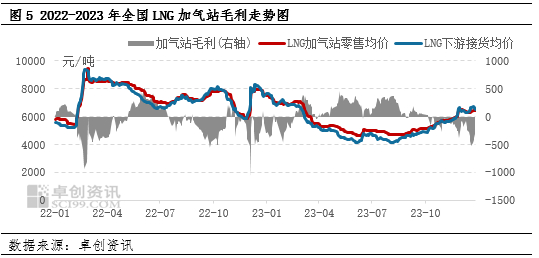 2023年上游企业毛利表现不一,但同比均呈现下滑走势。卓创资讯数据统计,2023年,LNG接收站平均毛利为573.75元/吨,同比下降54.15%,西北LNG工厂毛利为42.28元/吨,同比下降86.2%。