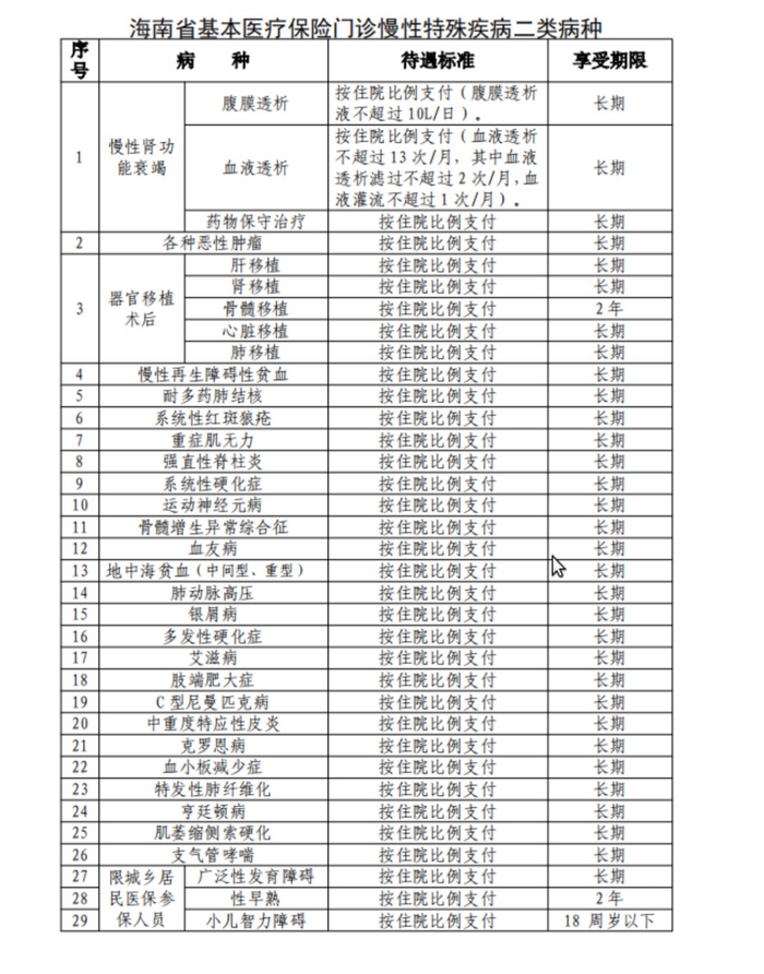 三是将15种病种待遇标准由定额结算调整为“按住院比例支付”,包括:调整部分门诊慢性特殊疾病结算待遇标准:将慢性肾功能衰竭(药物保守治疗)、器官移植术后(肝移植、肾移植、骨髓移植、心脏移植、肺移植)、慢性再生障碍性贫血、系统性红斑狼疮、重症肌无力、强直性脊柱炎、系统性硬化症、运动神经元病、骨髓增生异常综合征、血友病、地中海贫血(中间型、重型)、肺动脉高压、广泛性发育障碍、性早熟、小儿智力障碍等。