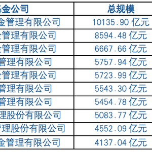 2023Q4基金公司总规模(不含货币基金)排名前十为:易方达基金管理有限公司 10141.4亿元,华夏基金管理有限公司8594.48亿元,广发基金管理有限公司 6667.66亿元,招商基金管理有限公司5757.94亿元,富国基金管理有限公司 5723.99亿元,嘉实基金管理有限公司5543.3亿元,博时基金管理有限公司5454.78亿元;南方基金管理股份有限公司5083.77亿元,汇添富基金管理股份有限公司4552.09亿元,鹏华基金管理有限公司4137.04亿元。