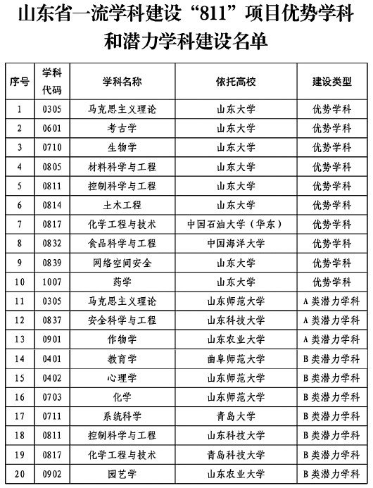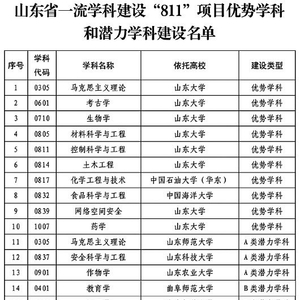 2022年10月,省委办公厅、省政府办公厅印发《关于深入推动山东高等教育高质量发展的若干措施》,正式提出实施一流学科建设“811”项目,支持省内高校8个现有国家一流学科创建世界一流学科;遴选部属高校10个左右优势学科,冲击国家“双一流”建设学科;遴选省属高校10个左右潜力学科,打造冲击国家“双一流”建设学科的后备梯队。