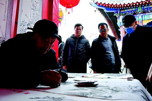 采访中记者得知,这位作画的老人,便是至今已有百年传承历史的省级非遗项目白银李氏树皮笔画代表性传承人李尚义,已是古稀之年的他手中所拿“木条”,实为榆树皮。对于此次能来天水参加甘肃省“非遗过大年 文化进万家”主会场启幕式老人感到非常开心,他告诉记者,作为省级非遗李氏树皮笔画传承人,他在现场作画,就是想展示和弘扬非物质文化遗产,让更多人了解李氏树皮笔画,了解非遗。也希望此次有缘能在天水收徒,借此让李氏树皮笔画这一家族非遗走向更广阔的天地。“虽才到腊月初十,我已感受到了天水渐浓的年味儿,也希望李氏树皮笔画的加入,能给全省非遗过大年活动增添一抹亮色。”