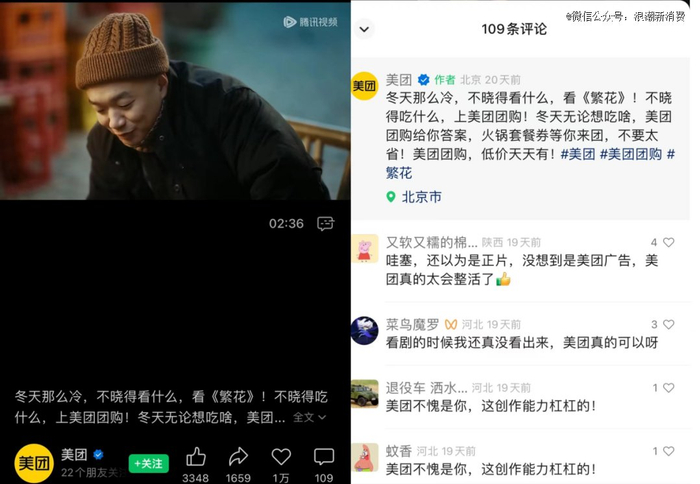 这次《繁花》中光明牛奶、万家乐、美团等品牌的广告等正是一个很好的例证,它们剧中的广告片段,不断在视频号等社交渠道引起二次传播,收获用户好评。