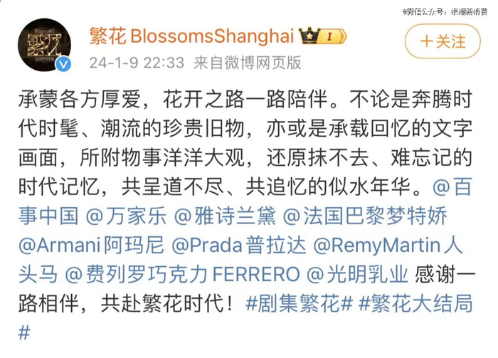 收官当日,10个相关话题登上微博热搜,其中,@繁花 官方连发四条微博感谢品牌商,#繁花 金主爸爸也顺势登上热搜,而网友们则评论称“这些赞助商有眼光”。