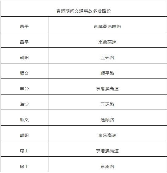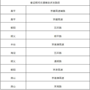 结合近三年数据,北京交管部门公布春运期间和春节期间交通事故多发路段。分别为: