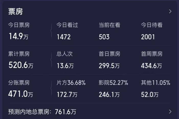 影片于1月20日上映,但上映后票房并不理想,截至1月24日16时,影片票房520万元,而预测内地总票房仅为761.6万元。